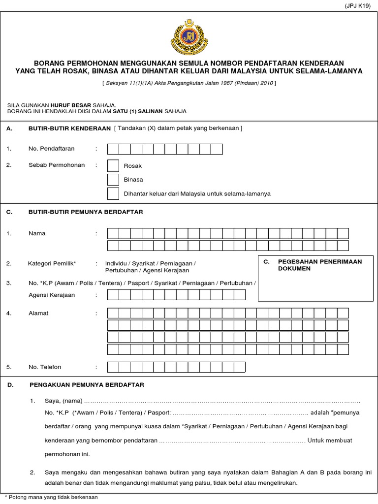 Jpjk19 Permohonan Menggunakan Semula Nombor Pendaftaran Yang Rosak Binasa Atau Keluar Malaysia Selama Lamanya Pdf